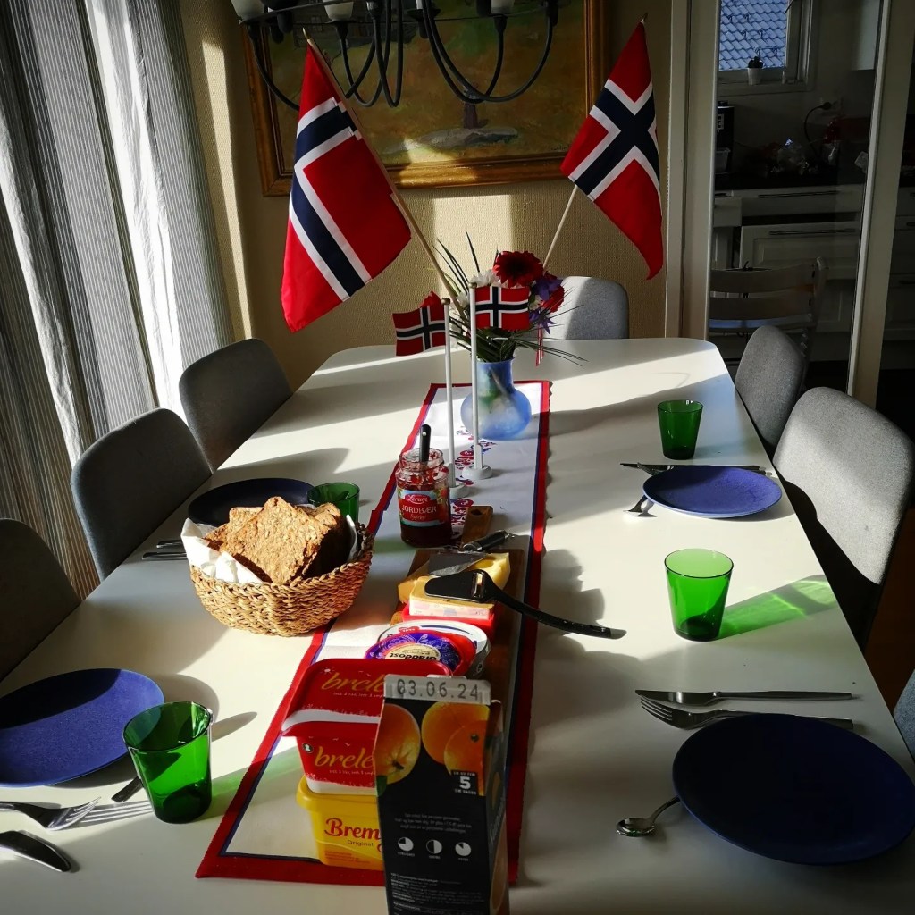 For ein fin dag det har vore. På biletet er me i ferd med å dekka til 17.mai- frokost til overnattingsgjestene våre og oss. Sola skein og det var allereie varmt og godt ute. Henrik og Eva Mari reiste til Stavanger for å feira med barnebarna der, og eg og Leif drog til Tu skule for å sjå Iben og Hella gå i barnetog og vera i lag med resten av familien i Kåsenhallen.