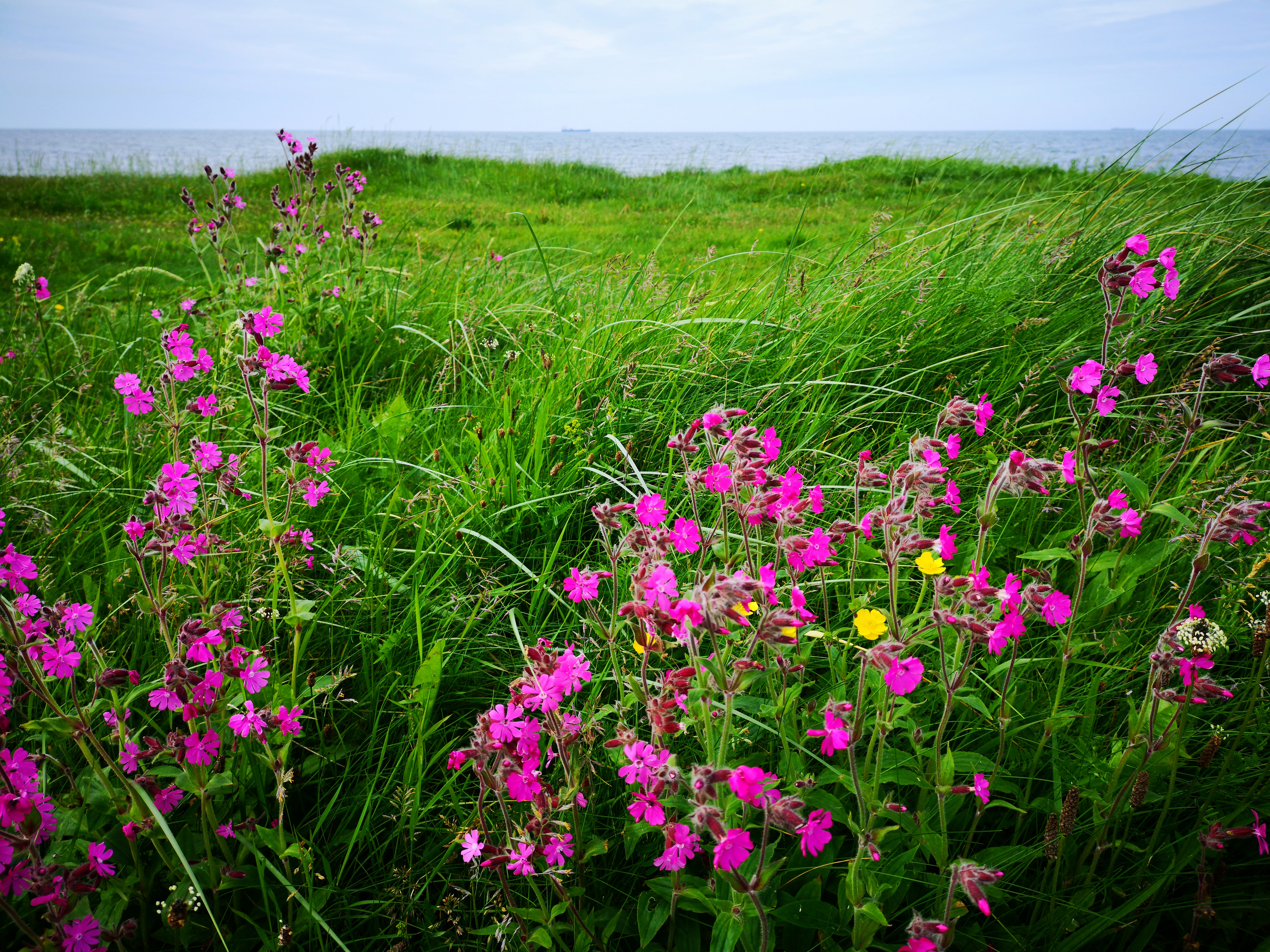 ein måne bak ei sommarsky, eit skip langt ut frå land