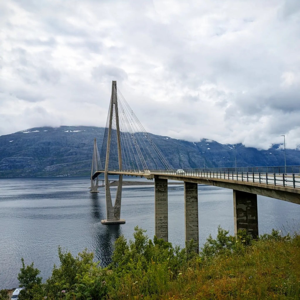 Etter startvanskane, (bokstaveleg talt), i går klarte me å innhenta vår eigen timeplan. Utpå kvelden, litt seinare enn tenkt, kom me fram til Mosjøen og vart varmt mottekne av Arild, nevøen vår, og kona Hege. Dei hadde gjort i stand eit bugnande kveldsmåltid til oss. Dette er tredje gongen eg besøkjer dei i Mosjøen, ein veldig vakker plass der det denne gongen bare vart ei overnatting utan at me fekk sett oss meir om. Etter ein lang og hyggeleg frokost med Arild, der me fekk ringt opp Ingrid på facetime og sunge bursdagssongen for ho som feirar 35-årsdagen sin i dag. Tenk at barna våre er så vaksne, og ikkje er ho eldste barnet vårt ein gong…
