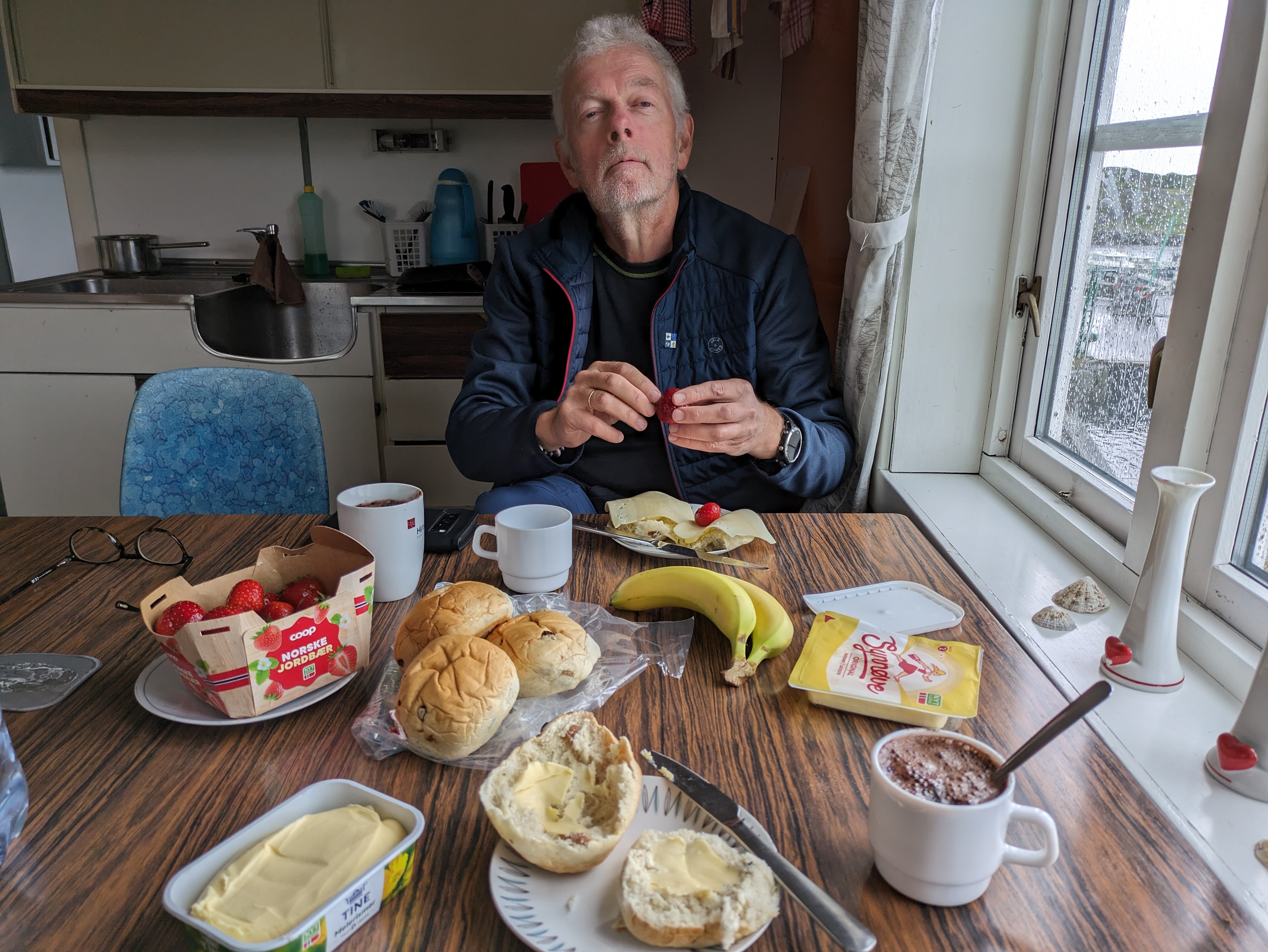 Me fann ein matvarebutikk og pakka litt ubevisst oppi det me fann til eit veldig enkelt måltid. Jordbær, rosinbollar, ein minipakke smør, oppskoren ost og makrell i tomat… Kaffi og knekkebrød hadde me i bilen.