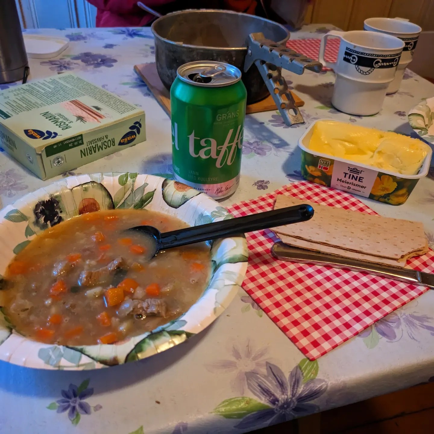 Ein av oss hadde frykteleg lyst til å slå opp teltet i kveld, men dessverre trumfa ver og vermeldingane tekstinga. Nå har me i staden fått oss ei campinghytte på Trofors camping, ein time sør for Mosjøen, som me deler med nokre ganske innpåslitne og veldig store myggar. Dette er ei «stor» hytte med plass til både køyesenger nok til fire personar og eit spisebord med både veggfast trebenk og to kjøkkenstolar. Som det framgår av foto så har me hatt ein betre middag. Akkurat som i sist hytte så går toget rett forbi. Det hender me høyrer toget på Bryne og, så det får me skriva på kontoen for heimlege lydar.