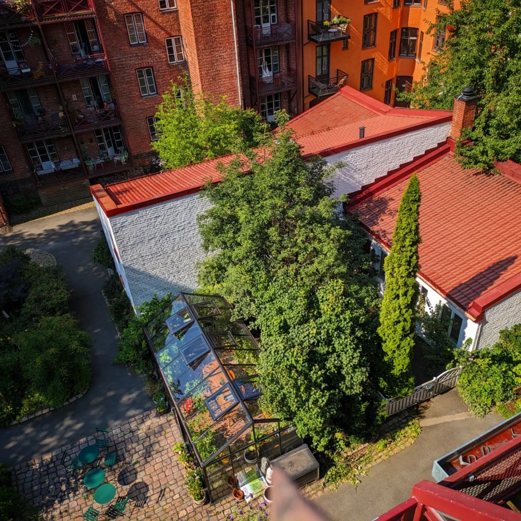 Dette er litt av utsikta frå Sunniva og Trygve sin balkong i Oslo. Det viser deler av ein fantastisk bakgard med drivhus, plantekassar, tre, benker og småbord og eit fantastisk uteareal for alle småbarna som bur der. Eg er imponert over byutviklinga i Oslo. Det er så mange grøne lunger, parkar og fellesareal, og bilane har forsvunne meir og meir ut av sentrum.