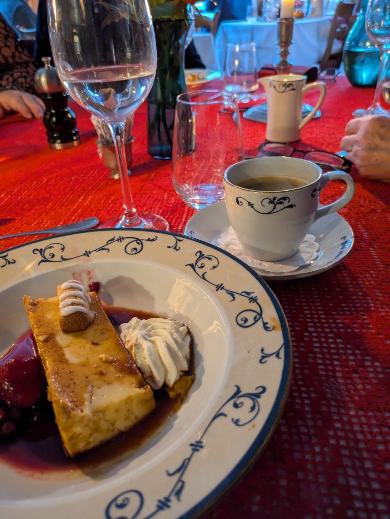 Maten var standsmessig, hummersuppe med heimebakt brød og karamellpudding med krem og frukt. Etter at måltidet offisielt var over, bar dei inn etasjefat med klementiner, dadlar og sjokoladekaramellar. Ryktet seier at staden snart skal opphøyra å eksistera i sin nåverande form, så det var kjekt å få det med seg. Veldig koseleg var det og at me fire fekk nokre timar for oss sjølve, det skjer ganske sjeldan.