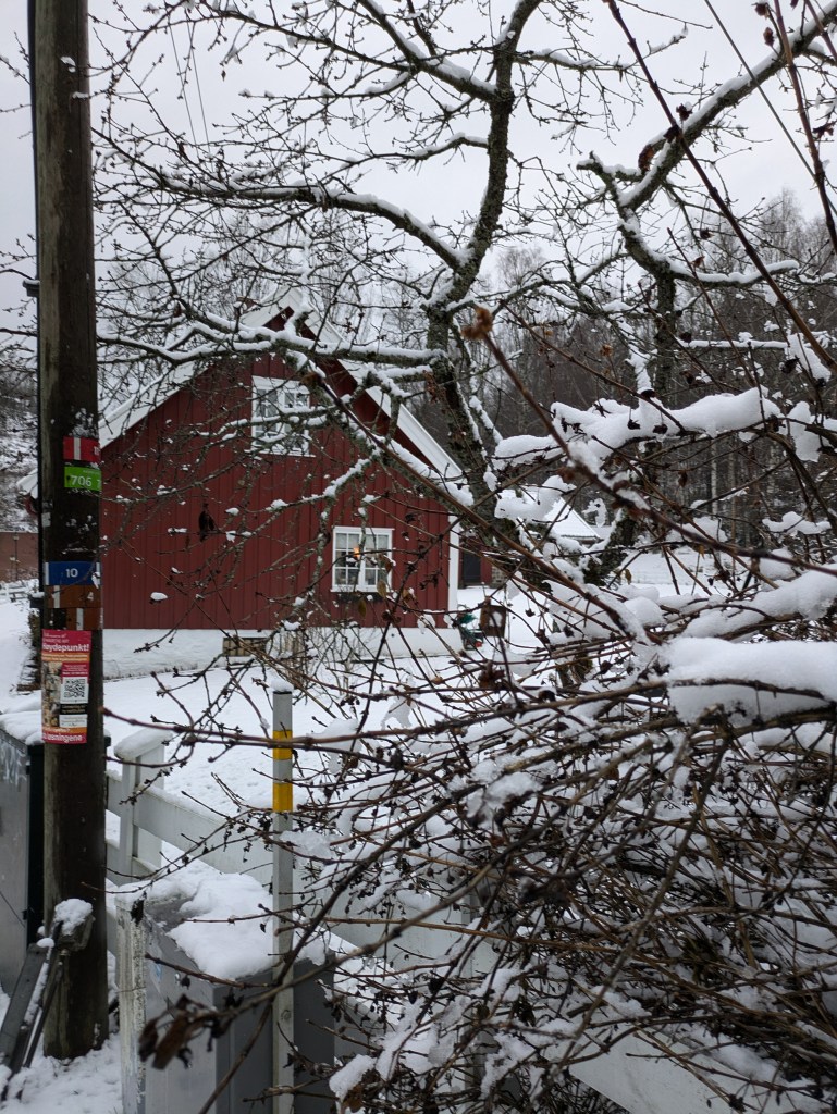 Dagen starta med sein frokost, kaffi og lilla strikking. Etterkvart tok eg og Eva Mari oss ut i nysnøen og nullgradersføret som innebar at snøen som låg på bakken var mest som vått snøslaps å rekna. Vakkert og vinterleg var det likevel.