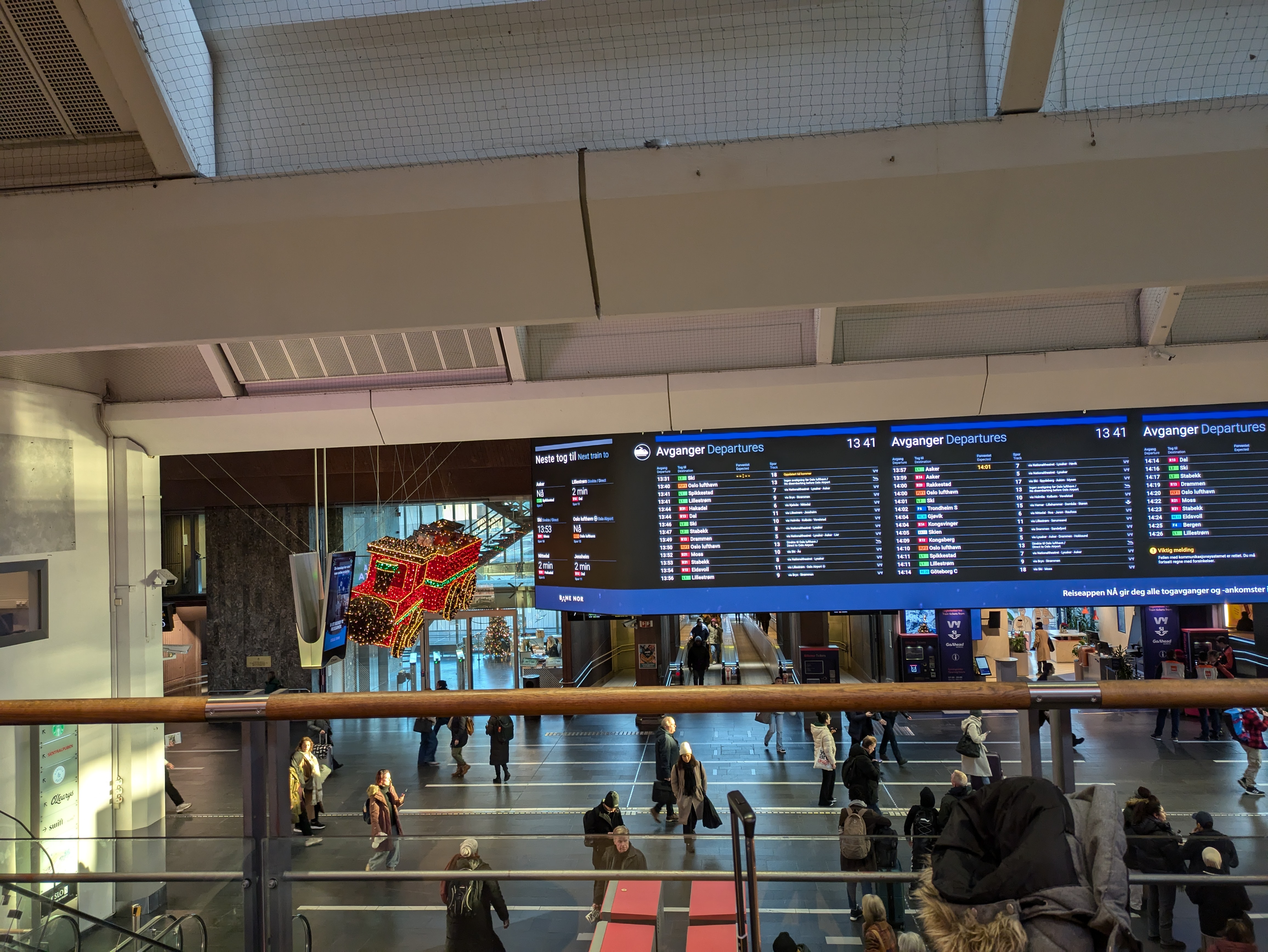 Bak luka i dag ligg ein julepynta Oslo S. På oppslagstavla.står det at ein må rekna med forseinkingar på grunn av feil i kommunikasjonssystemet, så dette kan jo bli interessant. Under taket heng eit amerikansk inspirert lokomotiv forma av raude, grøne og brune lyspærer, og eit veldig kunstig, smalt og spisst juletre går heilt til taket. Eg har vagla.meg på Starbucks der eg i mitt lettsinn har kjøpt ein kopp kakao, eg trøystar med at peparkake-mac-toffee med krem sikkert er mykje meir usunt.