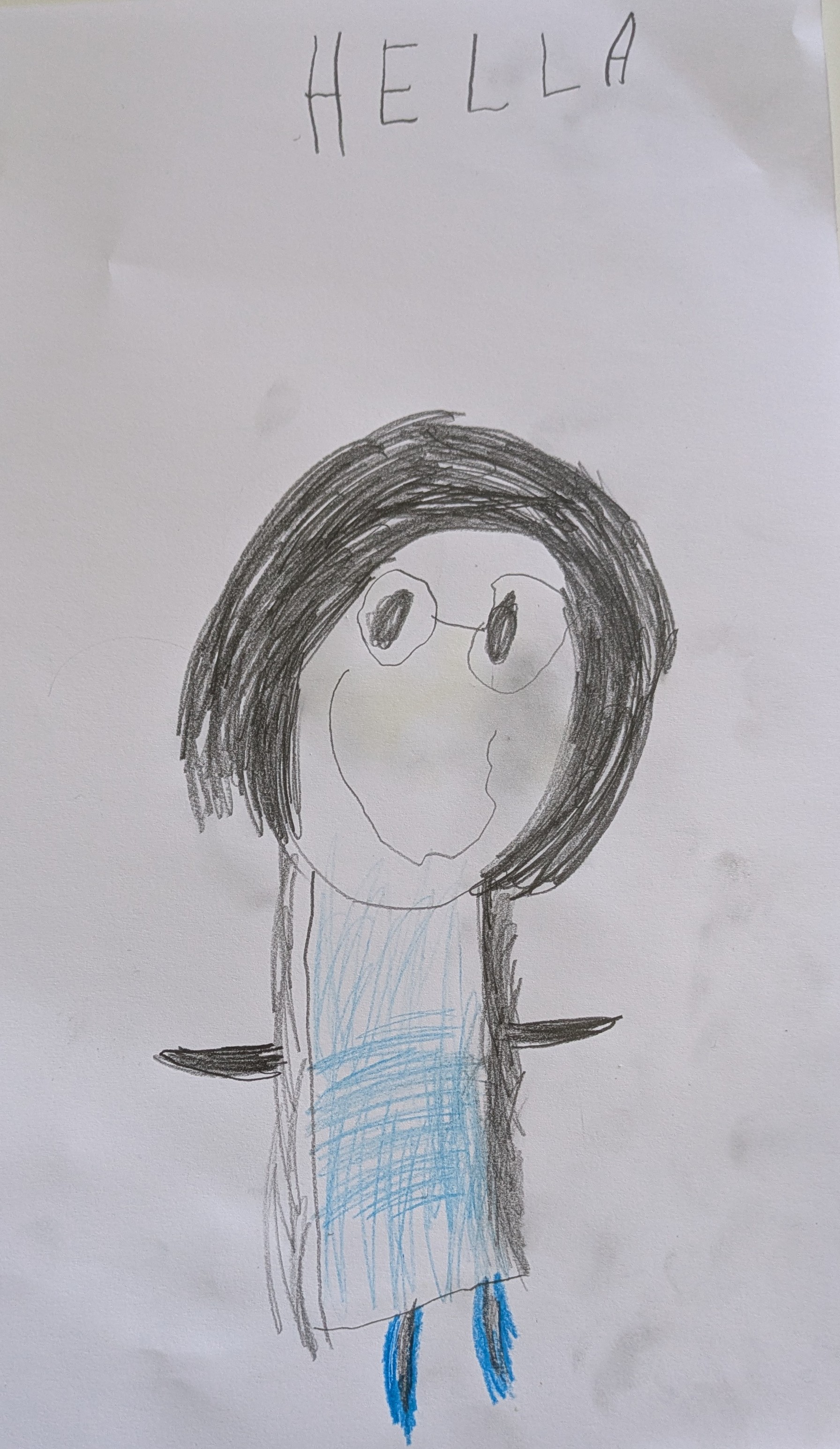 I dag har eg blitt teikna av fire- og- eit -halvt-åringen min. Eg synest at resultatet vart sjarmerande. Ho har fått med brillene, blå kjole og blå strømpebukse heilt i samsvar med dagens antrekk. Eg spurde om eg kunne få sko for å sjå om eg kunne få til ein bøy på foten nederst. Då såg ho oppgitt på meg og sa «Nei, mommor. Du he jo ikkje sko på dæg nå!». Det hadde ho heilt rett i, så det var ikkje meir å diskutera… Eg synest det med teikneutvikling er så spennande. Det er og veldig spennande å filosofera i lag med relativt små barn og prøva å leita seg fram til korleis verda sånn omtrent ser ut for dei.