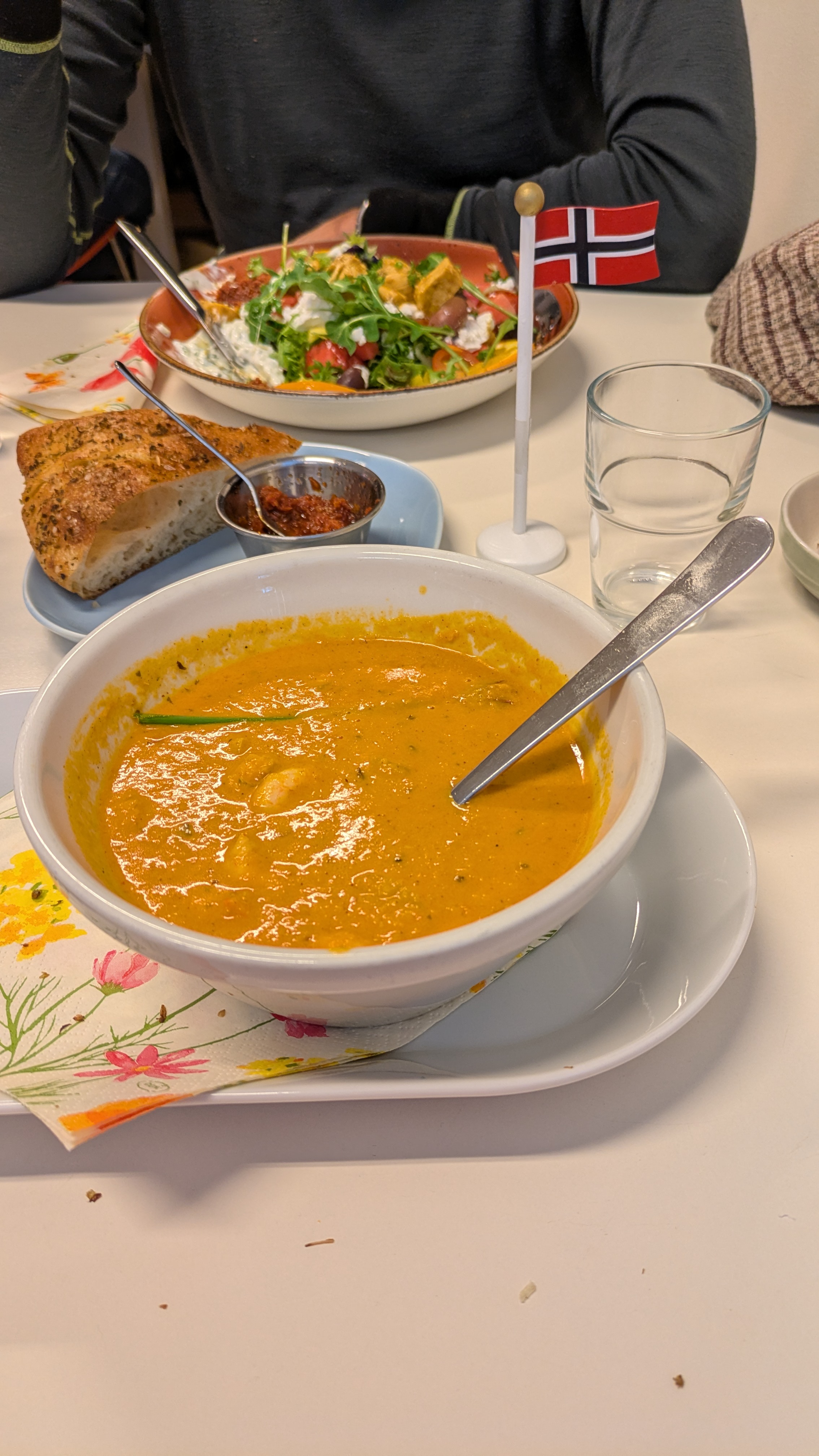 Dagen har gått i eitt, Eg stod opp til vaiande verandaflagg, nytrekt kaffi, pakkar på bordet og helsingar frå alle dei fire jentene mine. Leif bad meg med på lunsj på kjøkkenet der me fekk flagg på bordet.