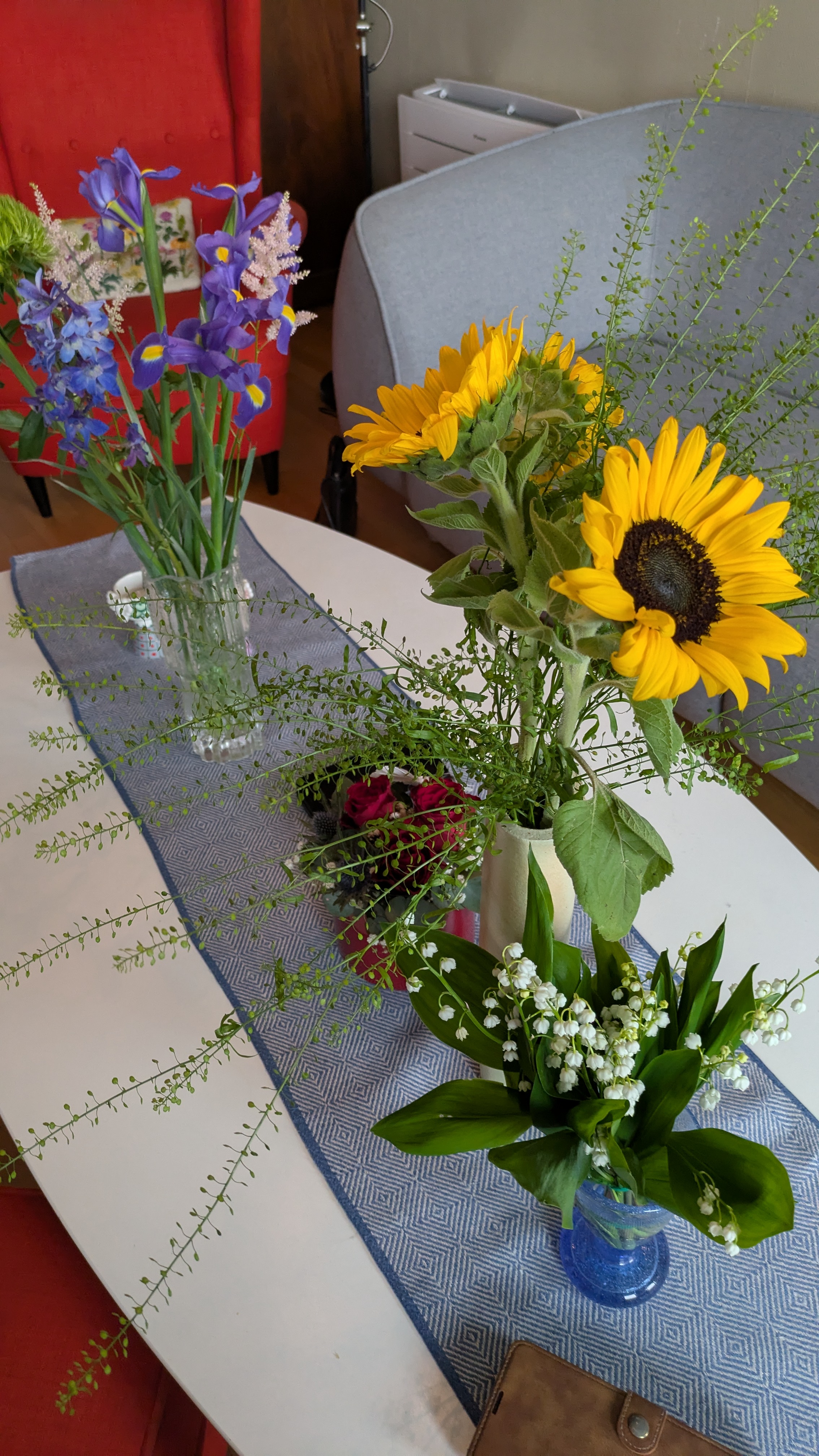 Foreldra mine kom ned litt over halv tre, så reiste me ut for å eta middag i lag saman med dei herverande barna og barnebarna på Møllehagen. Etterpå reiste me heim til kaffi rundt langbordet hos oss, og med syster, bror, svoger og svigerinne var me fjorten til bords. Syster mi hadde og med seg kake, og eg fekk endå fleire nydelege blomsterbukettar. Stova er full av blomar, og det er så fint. Eg burde jo sitja der litt dei komande dagane bare for å ha glede av blomane medan dei framleis står der og gløder i vasane sine. Det har vore fantastisk. Nå er eg litt trøytt og ør i hovudet, så eg trur eg takkar for i dag med ein relativt kort tekst og sørgar for å gi meg sjølv litt kveld.