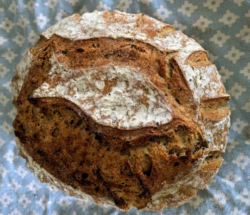 Brødet over er levert i rein godleik. Min kjære kollega Kari sende ei melding der ho antyda at ho snart kom til å ringa på døra for å levera eit brød. Det same gjorde ho på bursdagen min, og sidan både ho og Leif for tida er ihuga surdeigsbrødbakarar, har dei diskutert framgangsmåtar og oppskrifter. No hadde ho prøvd ut ein litt ny variant, og ville dela resultatet med oss. I likheit med min kjære mann har Kari det med å gjera ting skikkeleg og med stor energi. Eg veit at ho baker mange gonger så mange brød som dei et opp og driv gjevarteneste på brød i stor stil. Eit eksempel til etterfylgjing for fleire av oss. Legg merke til at det er merka med ICHTYS- fisken som er eit Kristusmonogram. Før ho gjekk sprang Leif ned i kjellaren og fann fram ein kakeboks det stod Merry Christmas på. Den fekk ho med seg heim fyld med hans andre bakepasjon: løvtynne, sprø, heimebakte knekkebrød. Eg liker den formen for deling.