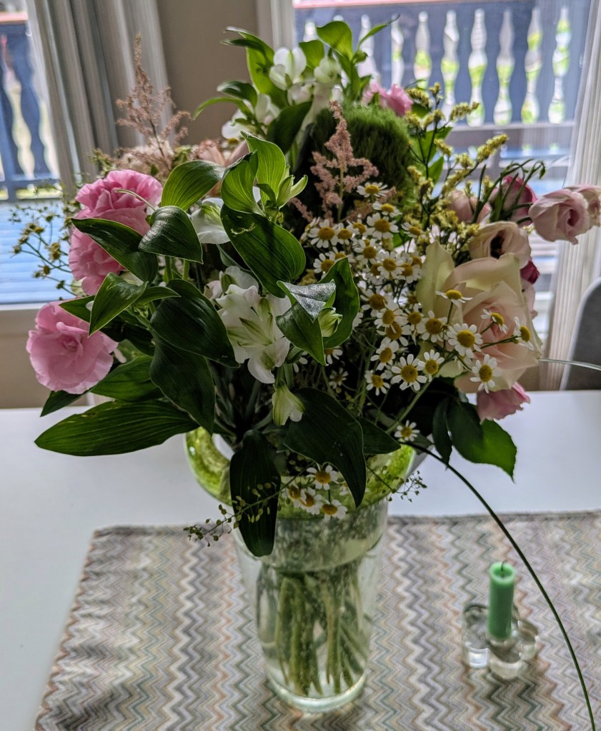 Framleis har eg fine bukettar frå feiringa sist helg, og eg klarer ikkje la vera å fotografera dei før dei visnar. Eg liker forresten veldig godt å setja i saman blomsterbukettar sjølv, så nå frydar eg meg stort over at utvalet i hagar, enger og grøftekantar aukar for kva dag som går.