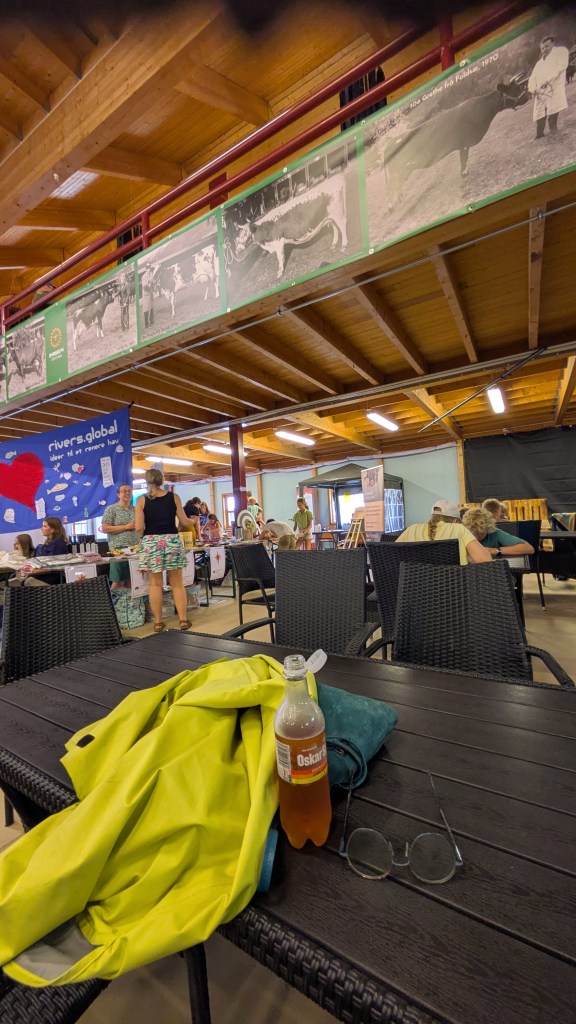 Me var så heldige å bli inviterte inn på eit tun med mange barnefamilier, fleire av dei frå Bryne, så Iben hadde nokon der ho kjende litt frå før. Overnatting i lavvo og soving i sovepose var i seg sjølv nytt og spennande. I natt kom århundres regnskyll med vidopne himmelsluser, og det nyimpregnerte teltet vårt viste seg å ikkje vera veldig vanntett. Iben og eg vakna nesten utan luft i madrassen og med partier av golvet dekka med vatn. Bøker og tegnesakar var godt oppbløytte, og det kan tenkjast at strikketøyet mitt kan vrist opp…Heldigvis var kleda i vanntette koffertar og bagar.