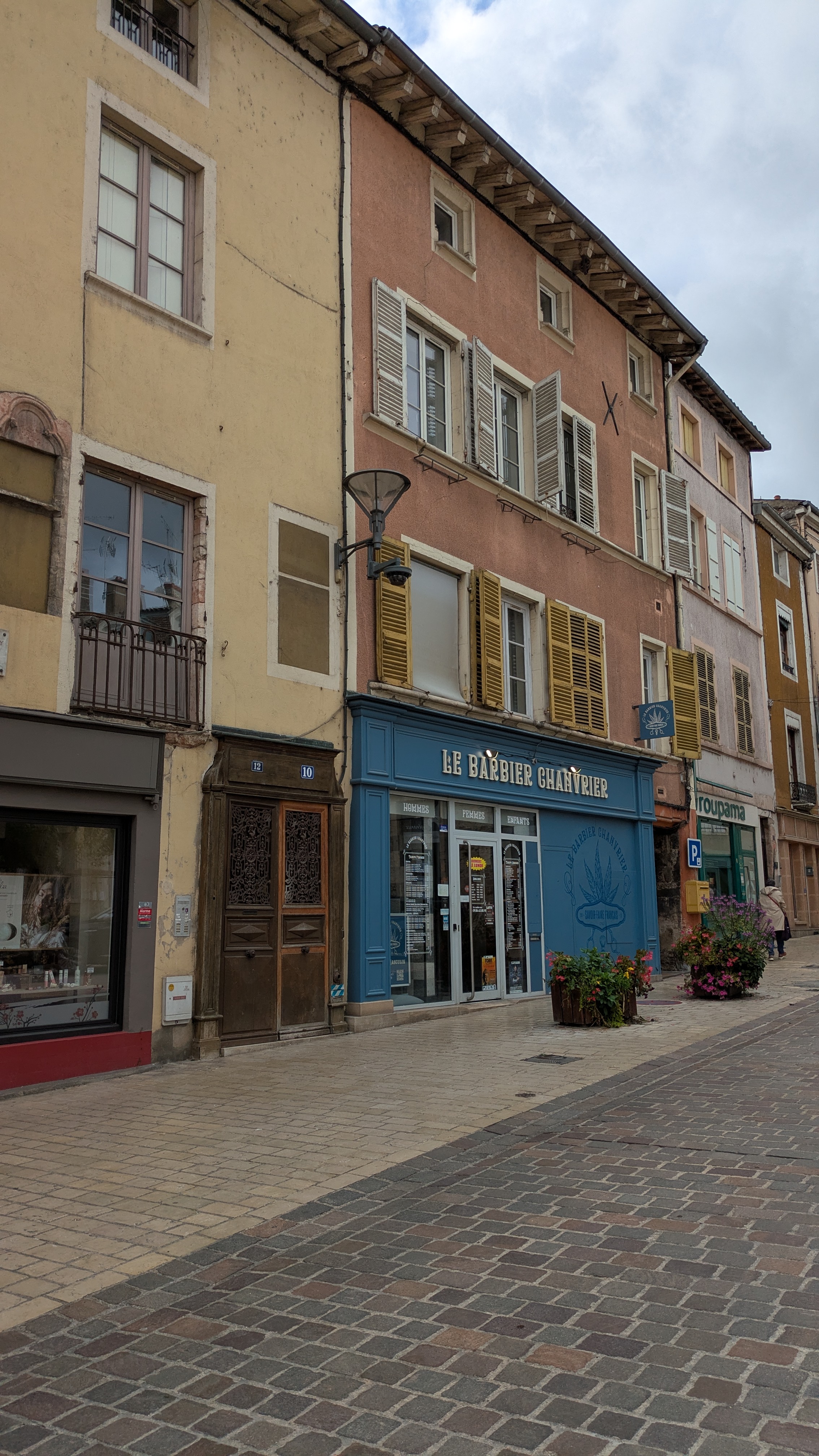 Me fann ein liten by der me klarte å finna vegen til ein garnbutikk. Den søte ekspeditrisa sa litt fortvila at ho snakka veldig lite engelsk. Eg sa at eg snakka un petit, petit peut frances. Då vart ho overlukkeleg og på omtrent like vaklande fransk og engelsk kunne finna omtrent det eg leita etter i den langt i frå sjølbetente butikken. Det var vanskeleg å finna reint ullgarn, men me klarte det.I etterkant angrar eg på at eg kanskje burde kjøpt meir. Etterpå vandra me litt meir i gatene og drakk cappuccino og cafelatte på ein liten fortauskafé. Akkurat då var det faktisk solgløtt.
