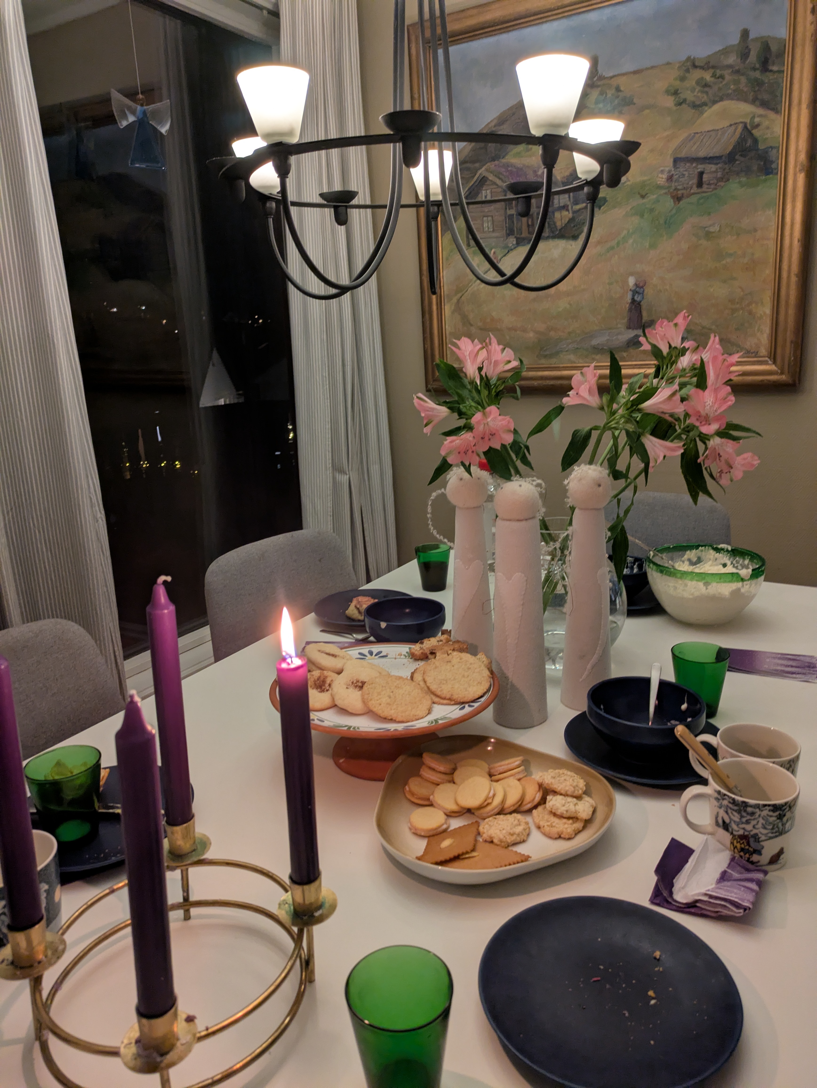 I fjor, seint ute som eg alltid er, så var eg lukkeleg over at det framleis var godt med lilla lys i butikkane, av og til har eg måtta nøyaktig meg med mørkeblå fordi eg har vore for seint ute. Etterkvart forstod eg at det var fordi dei fleste ikkje bruker lilla lys lenger… Eg er ikkje den første som fangar opp nye trender… Og lilla lys i heimane er heilt sikkert ikkje ein veldig gammal tradisjon det heller, men enn så lenge så er adventstida lilla heime hos oss, så får det bli jul sånn litt etter kvart.