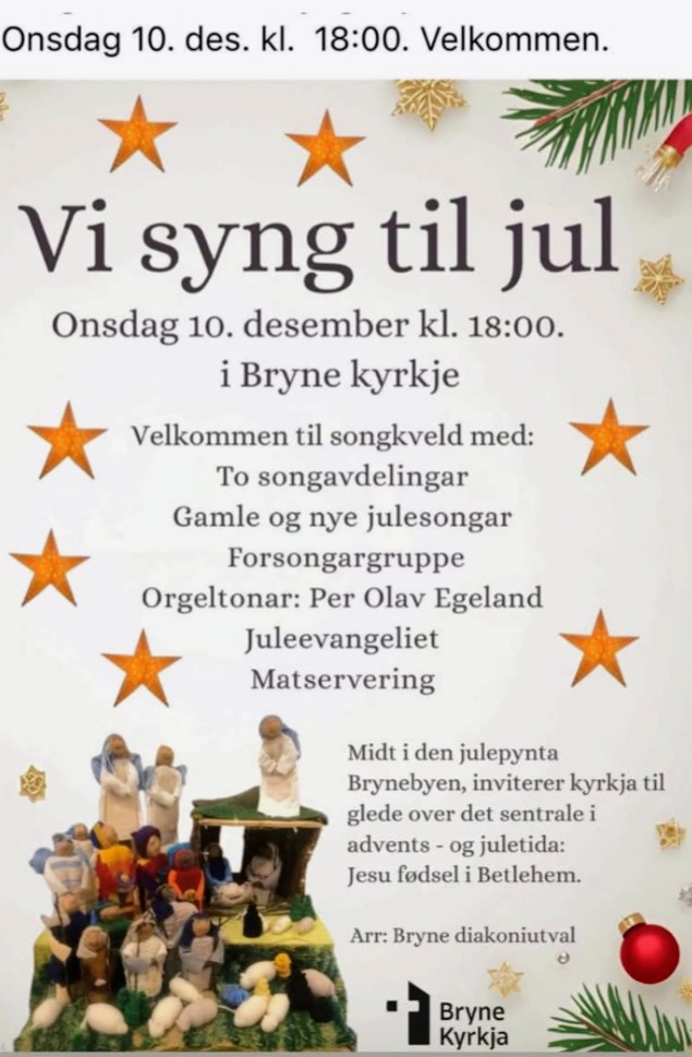 I dag kan eg by på ein invitasjon dersom du les dette før klokka seks i dag og bur relativt nær Bryne. Eg er med i diakoniutvalet som er arrangører, så nå har eg bakt ei kake til arrangementet og skal snart til kyrkja for å rigga til kyrkjeromet.
