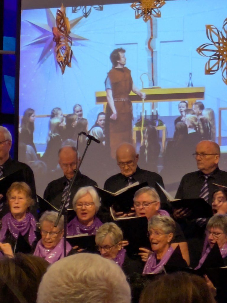 Biletet over kan sikkert vera litt forvirrande, det viser eit utsnitt av vaksenkoret med ein av dei to storskjemane bak. Det som foregjekk vart samtidig vist på storskjerm slik at alle kunne sjå betre. På skjermen ser ein døyparen Johannes i vaksen alder med nokre frå barnekoret rundt seg.