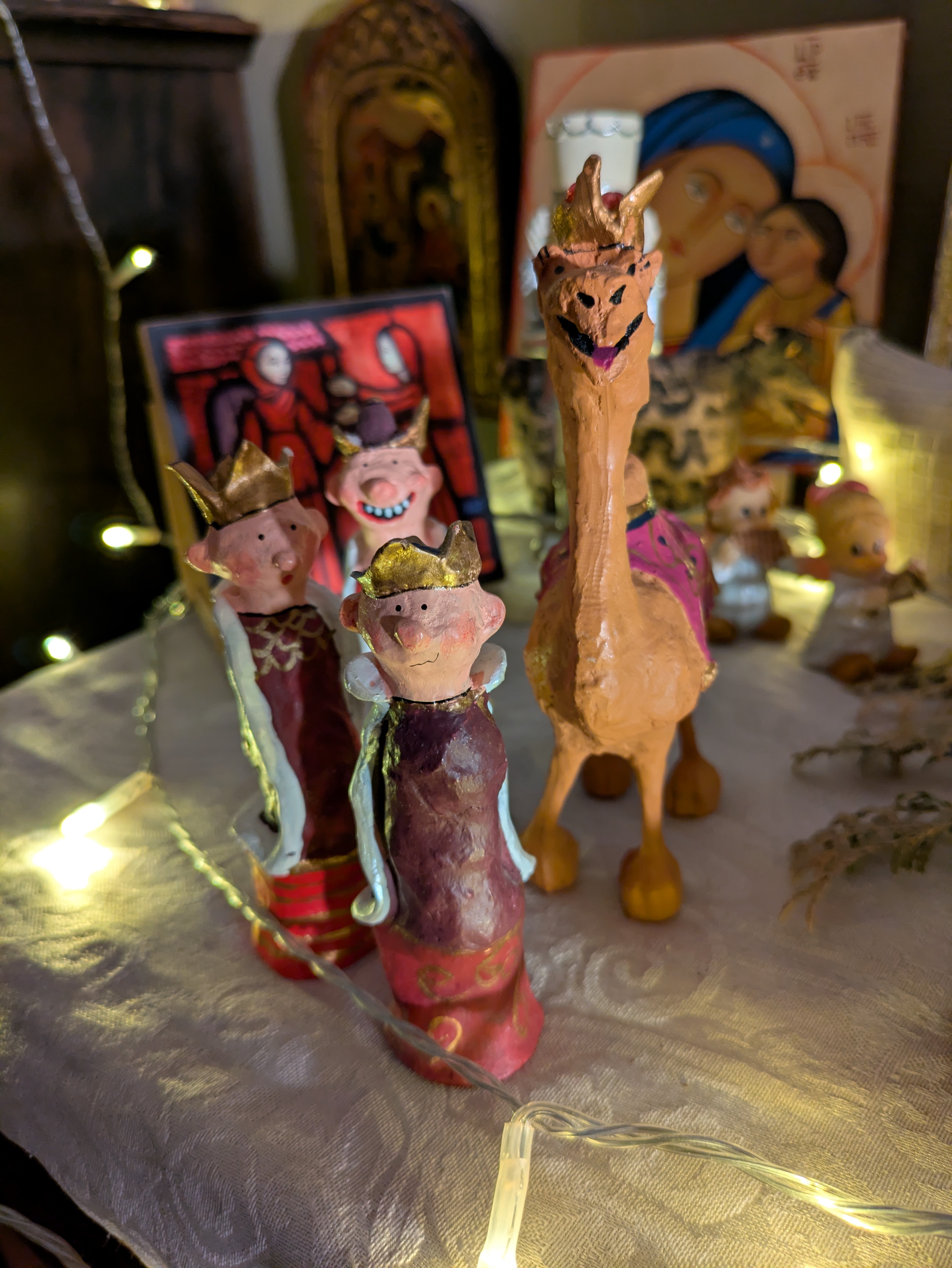 For meg står dei som leitande menneske, drivne av ein rastlaus lengt, dei kom frå ein annan samanheng me veit lite om, men skar seg plutseleg inn i det som mange år seinare skulle bli kristendomen sin historie. Dei står der i ulike utgåver i julekrybbene våre, dei på biletet over er frå ei av mine. Likevel er det visst nok sannsynleg at besøkjet deira ikkje høyrer til fødselshistoria i stallen, men at Jesus godt kan ha vore eit par år då dei kom.