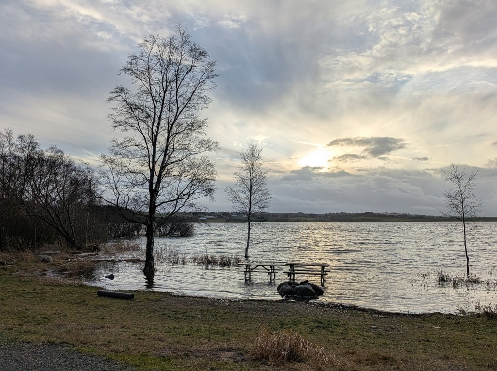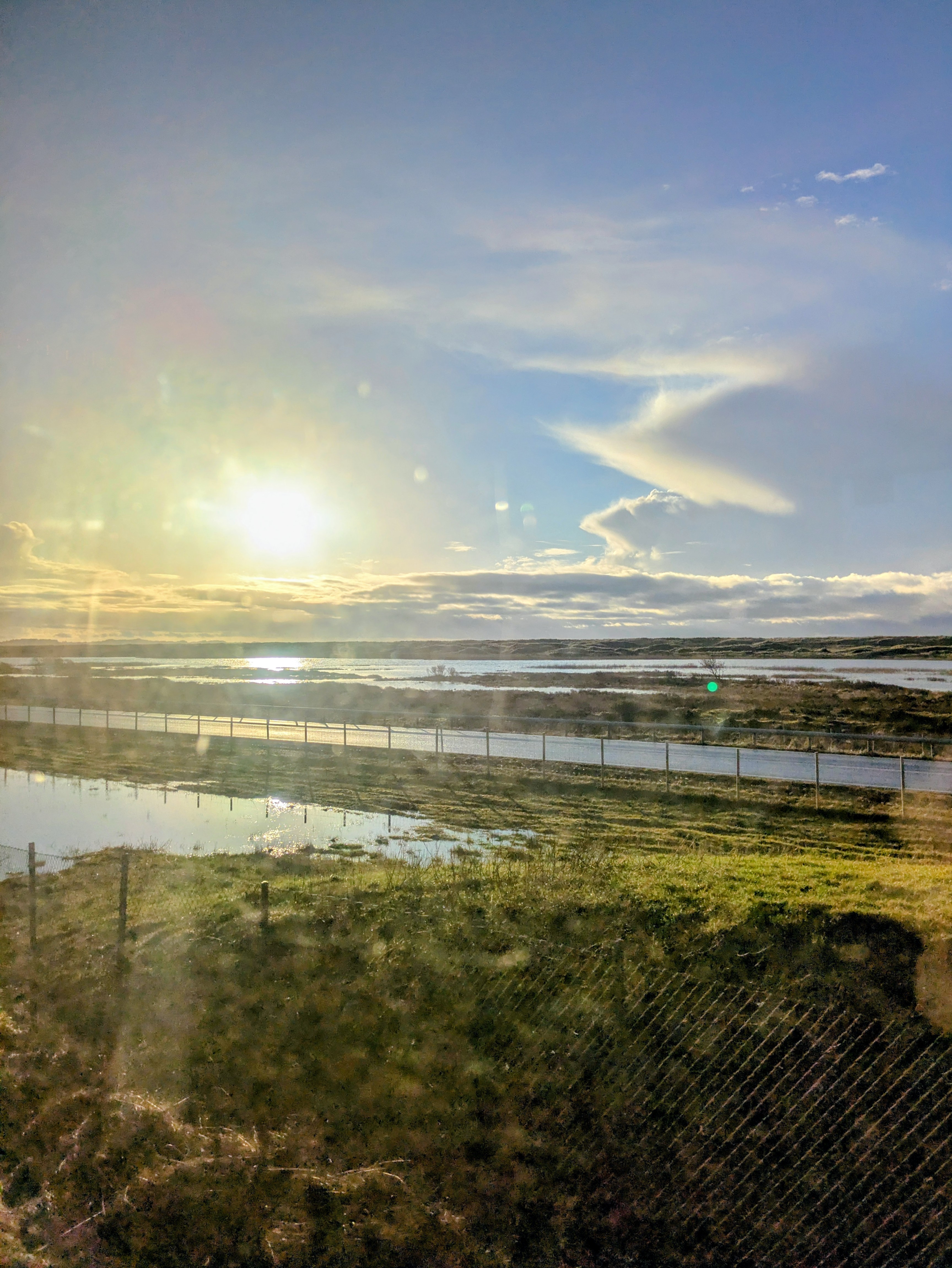 Nå er eg trygt plassert på toget, som enn så lenge går og er i rute. Det er nydeleg, låg desembersol utanfor vindauget, eg har site på kne i setet og fotografert, for strekningen mellom Bryne og Egersund er det vakraste på heile togturen.