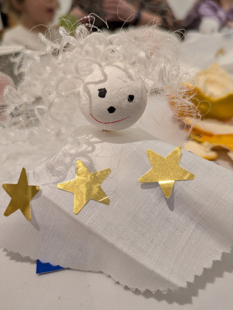 Dette er Hella sin juleengel frå i går. Eg fekk fylgja henne på adventklubb for femåringar. Alle femåringar var inviterte i fylgje med ein forelder eller besteforelder. Det var forteljing, song, posar med kakemann og klementin, eplejus, laging av englar og gang rundt juletreet. Det var veldig fint tillaga, og stas å vera invitert til noko utan storesystrer og slikt.