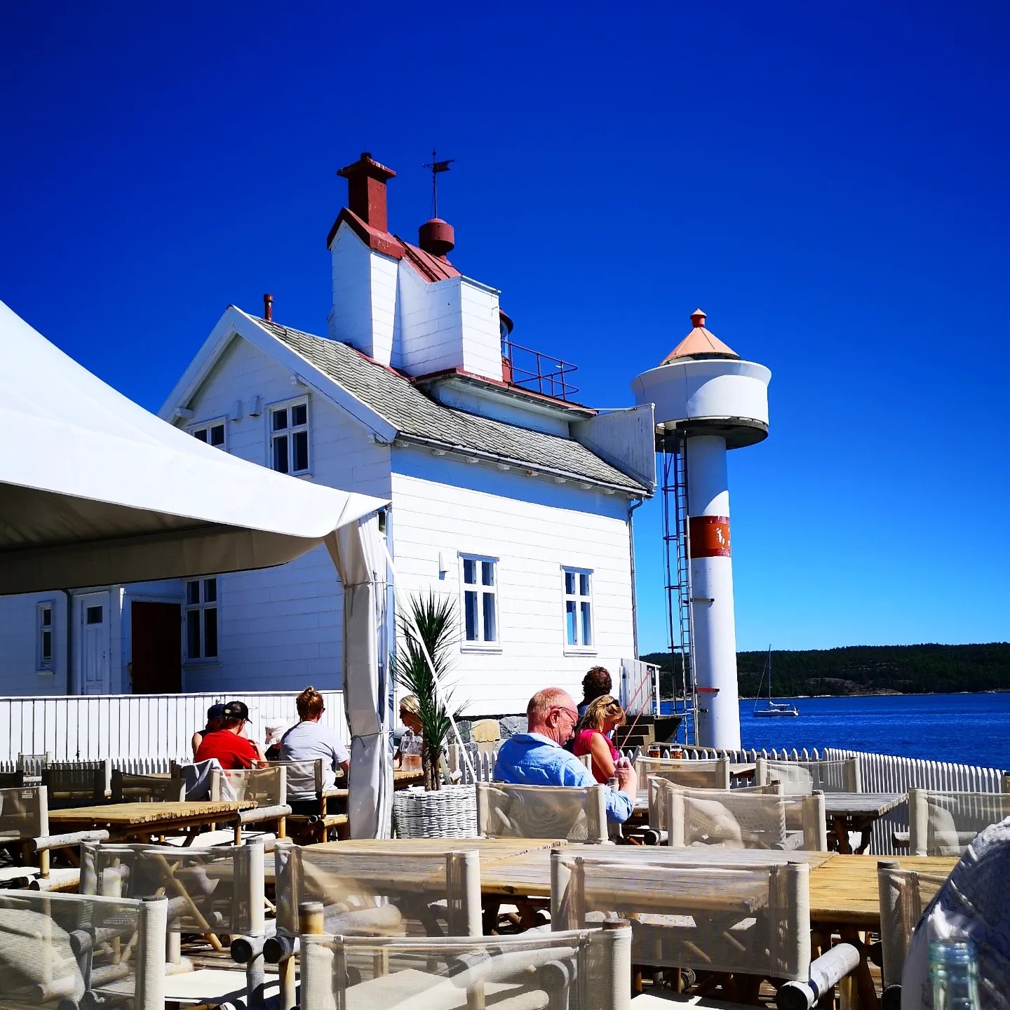 Me kjørde ut på Hurumlandet, og det var så fint og grønt med syrinar og valmuer i hagane og brygger med kafear og små bord. Me stansa på brygga på Filtvedt for å gå til ein lunsjplass det Eva Mari hadde vore før ein gong, Villa Malla som låg like ved ei strand. Der var det restaurant med lunsjbuffet der ein kunne sitja ute og sjå ut over havet, eller sitja inne i eit stort selskapslokale. Me sette oss ute i idyllen. Maten var kjempegod, og det var så varmt at me måtte trekkja inn i skuggen då me kom til kaffen.